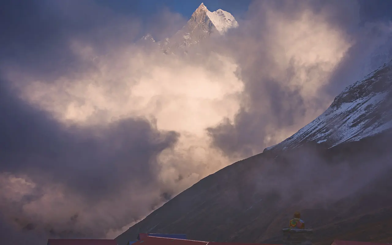 One last gradual ascent takes you to the amphitheatre of Annapurna Base Camp (4,130 m), which is made up of dramatic rock and ice walls. The next day, sunrise lights up Hiunchuli and Annapurna South with a golden glow, and soft pastel light fills the sanctuary at dawn.