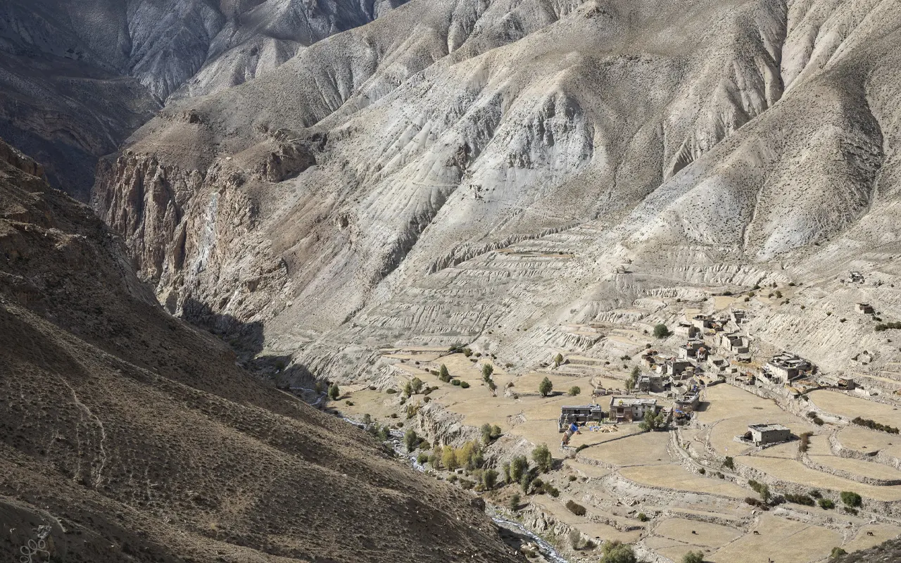 Before the checkpoint at Sulighat, where you enter Shey Phoksundo National Park, you have gone by small villages, rivers, and forested areas. The culture of Tibetan Buddhism is evident in the villages along the road. Keep on walking along the river till you arrive in the village of Chhepak at 2,680 m / 8,792 ft.