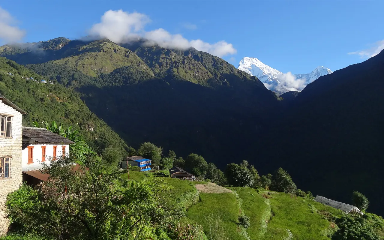 You drive approximately 1.5 hours from Pokhara to Nayapul (1,070 m / 3,510 ft) after breakfast in Pokhara. You show your permits at the checkpoint of Nayapul and start walking. The path is laid along a river, traversing small villages and agricultural land. The initial section is soft and relaxing.